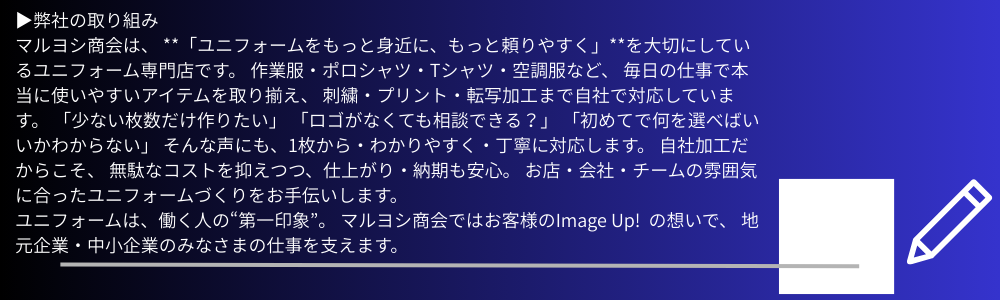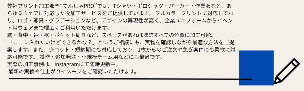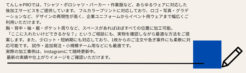 デザイン相談から加工・仕上げまで自社一貫で行い、企業様の目的に合わせた最適な提案を行います。 企業PR・作業着・販促用ウェアまで、**「伝わるユニフォーム」**を形にするなら、ぜひ てんしゃPRO にお任せください。