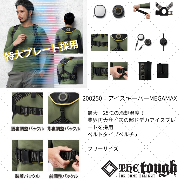 ストレッチ性・通気性に優れたメッシュベスト。 2か所のフロントバックルでより快適な着用感を実現。 保冷剤を4種類用意、大きさによって4.5~9時間の冷却時間