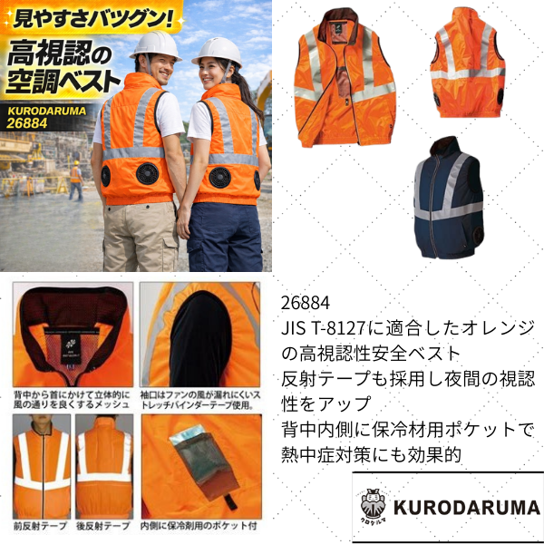 JIS T-8127に適合したオレンジの高視認性安全ベスト 反射テープも採用し夜間の視認性をアップ