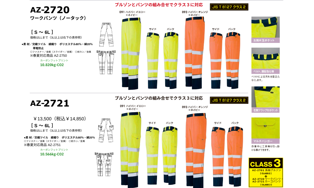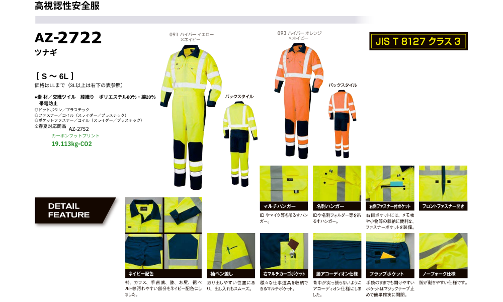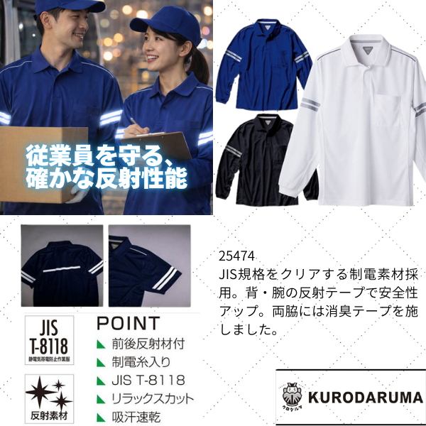 JIS規格をクリアする制電素材採用。背・腕の反射テープで安全性アップ。