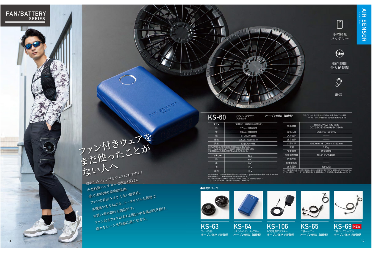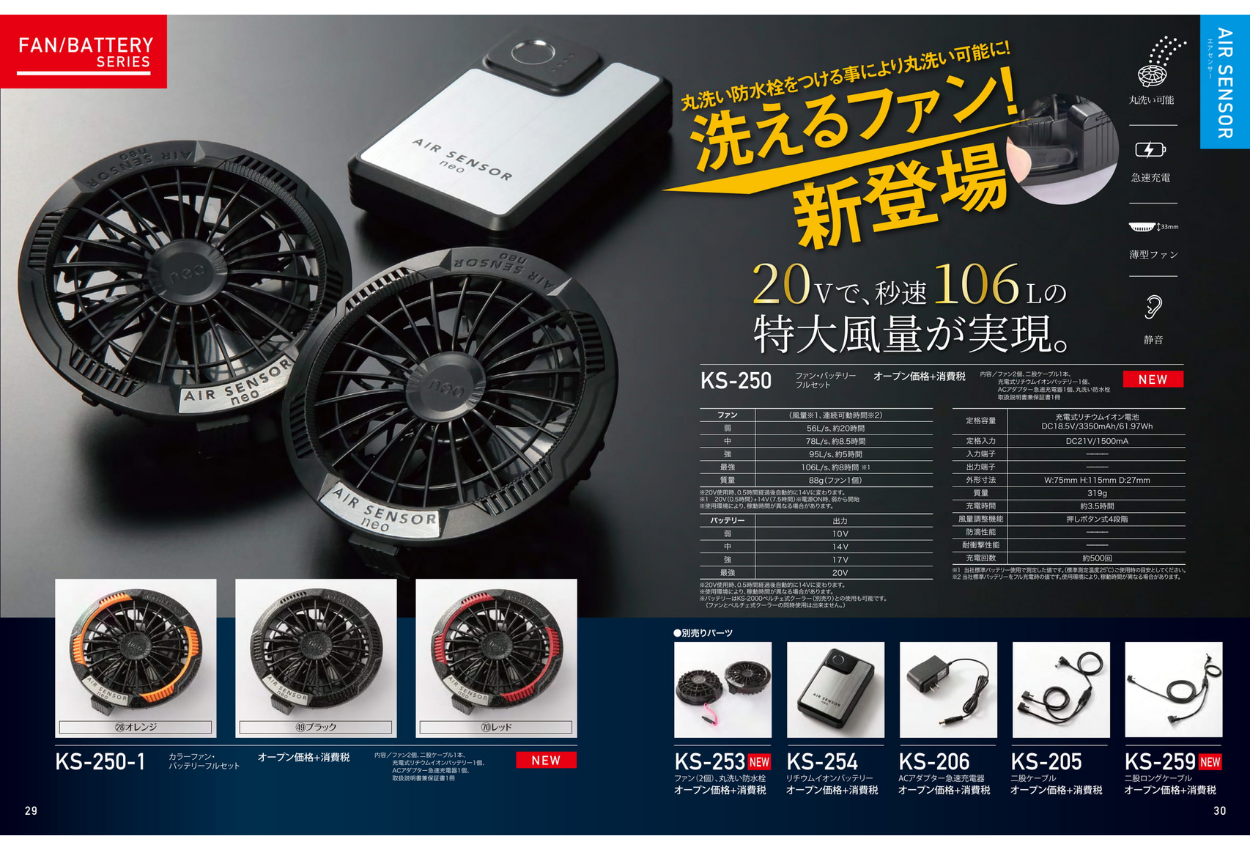 ☆KS-250:最高出力20V・最大風量106ℓ・約3.5時間の急速充電・薄型ファンを使用して体への違和感も軽減・防水栓を使用して丸洗い可能に!