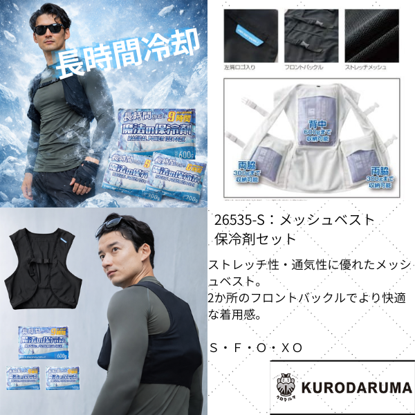 ストレッチ性・通気性に優れたメッシュベスト。 2か所のフロントバックルでより快適な着用感を実現。 保冷剤を4種類用意、大きさによって4.5~9時間の冷却時間